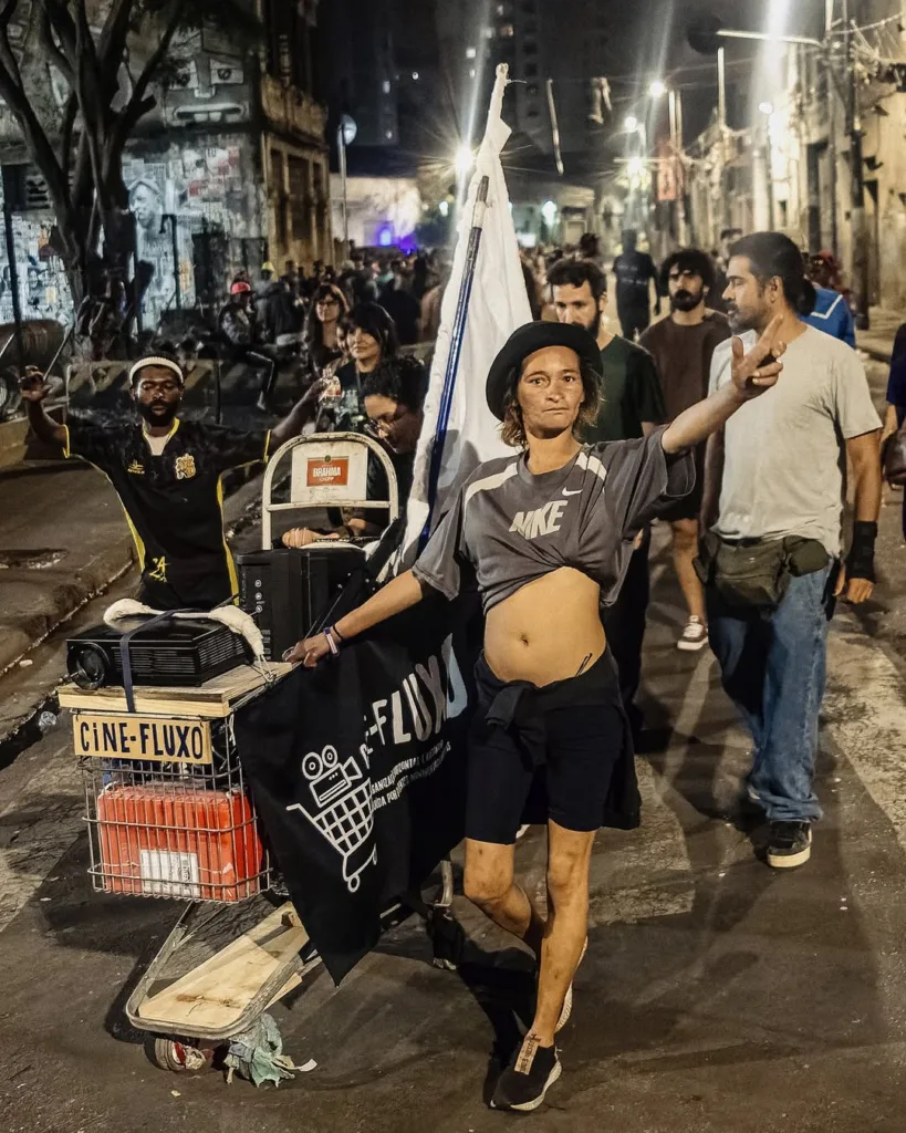 Com um carrinho de supermercado adaptado, equipado com bateria de carro, projetor e caixas de som, o Cine Fluxo circulava pelo antigo território da chamada Cracolândia, na rua dos Protestantes, e exibia filmes. Além dos curtas-metragens com pipoca e suco, o coletivo também distribuía insumos de redução de danos, como piteira, camisinha e kit de higiene.