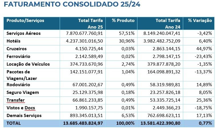 • Outros segmentos tiveram retração. A Locação de Veículos recuou 1,35%, totalizando R$ 374,7 milhões, enquanto os Pacotes de Viagens/Lazer caíram 13,37%, para R$ 142,1 milhões.